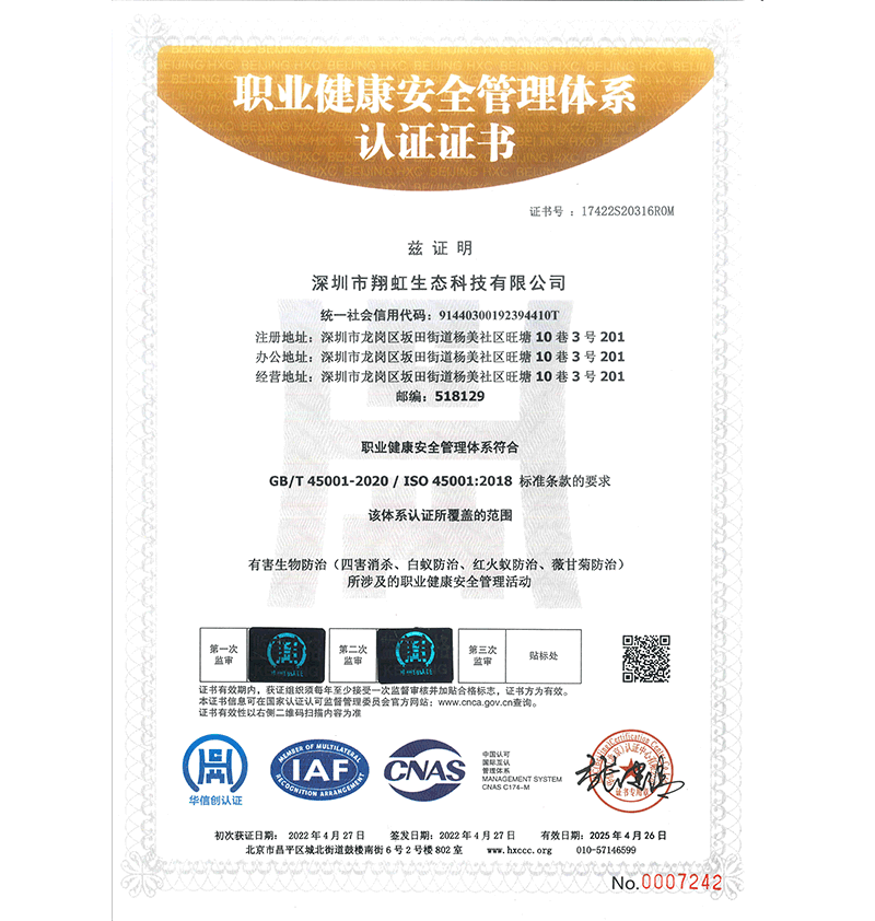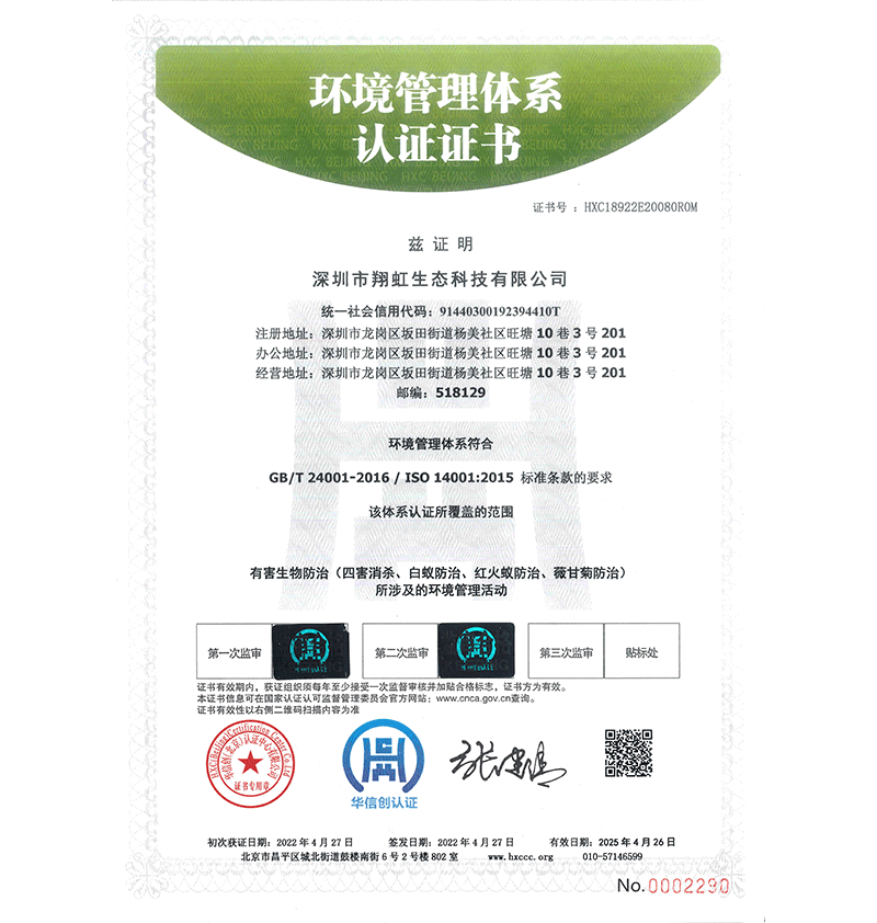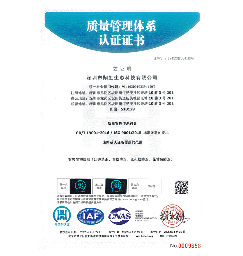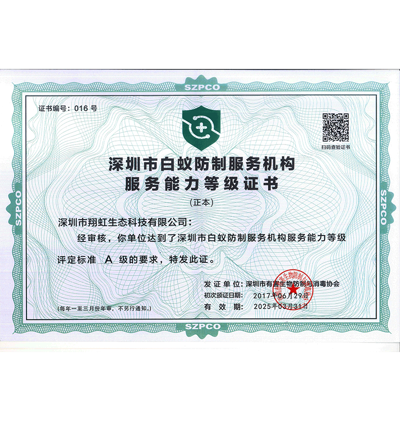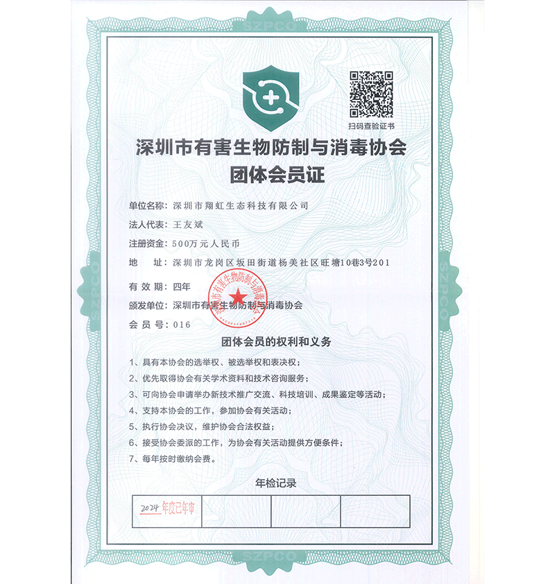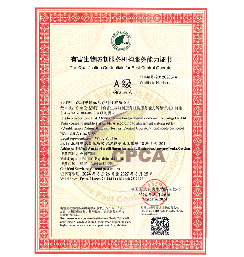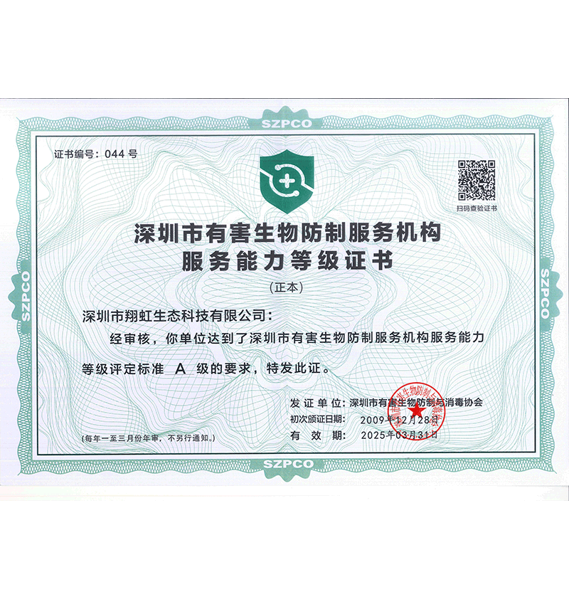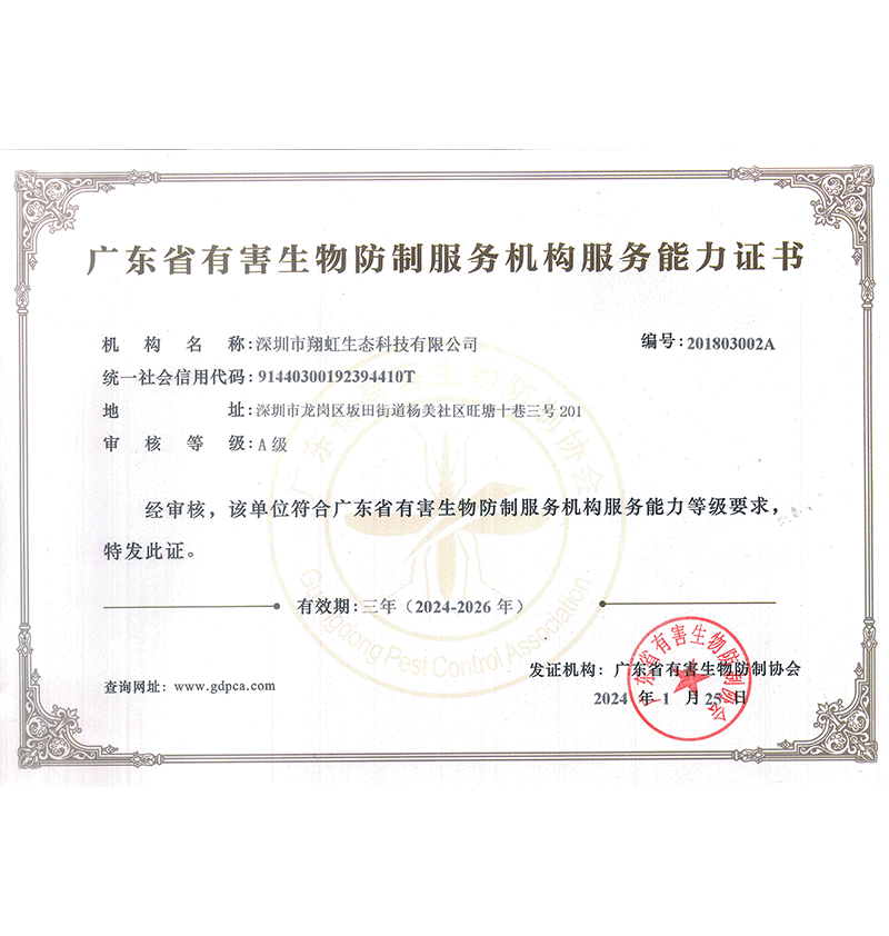 深圳市翔虹生態(tài)科技有限公司成立于1995年,是深圳最早成立的專(zhuān)業(yè)蟲(chóng)害防治公司之一。公司發(fā)展至今獲得全國(guó)有害生物防制服務(wù)A級(jí)資質(zhì)、廣東省有害生物防制服務(wù)A級(jí)資質(zhì)、深圳市有害生物防制服務(wù)A級(jí)資質(zhì)、廣東省有害生物防制服務(wù)A級(jí)資質(zhì)、深圳市有害生物防制服務(wù)甲級(jí)資質(zhì)的單位,是中國(guó)有害生物防治協(xié)會(huì)會(huì)員、廣東省有害生物防治協(xié)會(huì)會(huì)員、深圳市有害生物防治協(xié)會(huì)理事單位,多次獲得“深圳市十佳消殺單位”榮譽(yù)。